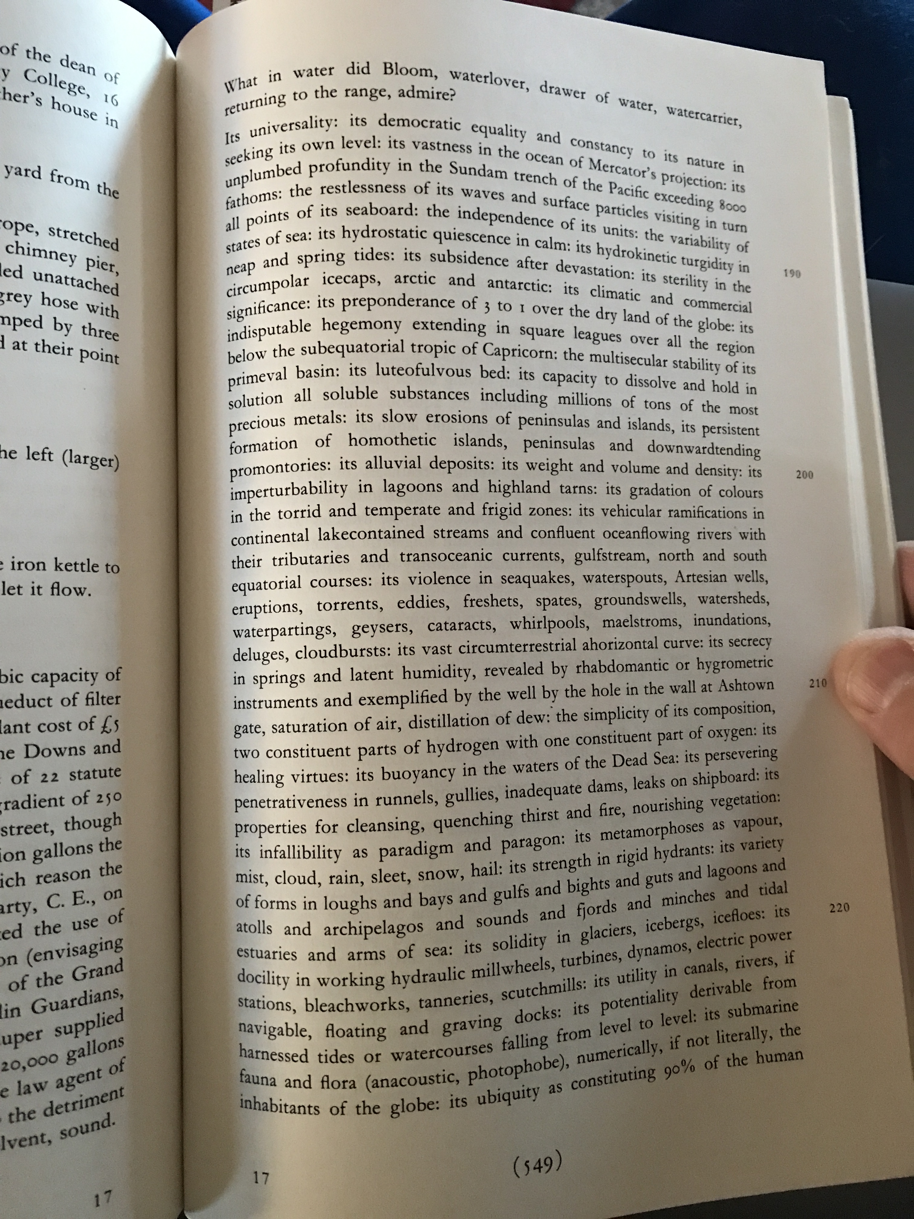 I’ll end with what made me appreciate my own resistance to laziness, a paragraph (most of it) from Ulysses that has to do with water. Who doesn’t like water? Even if you hate it or are afraid of it you have to love it. But even if you admit loving it, as I do, chances are you don’t know all the words in this paragraph relating to it. The context for this passage is simply what the book’s hero (Leopold Bloom) admires about water as he’s putting the kettle on the stove to make hot chocolate. He’s a good human but not someone intellectually out of reach, and these words are the invisible narrator’s and not necessarily ones Bloom knows, but it doesn’t really matter. What does matter, I think, and why I love not just this passage but most of this book, is that it shows us what our brains and hearts are capable of with a little effort and desire: appreciating beauty and gaining knowledge and experience that form the cycle (similar to the cycle of water) of being. That’s really what it comes down to. And if we pay attention, and want to write better, these kinds of things can help. A lot.